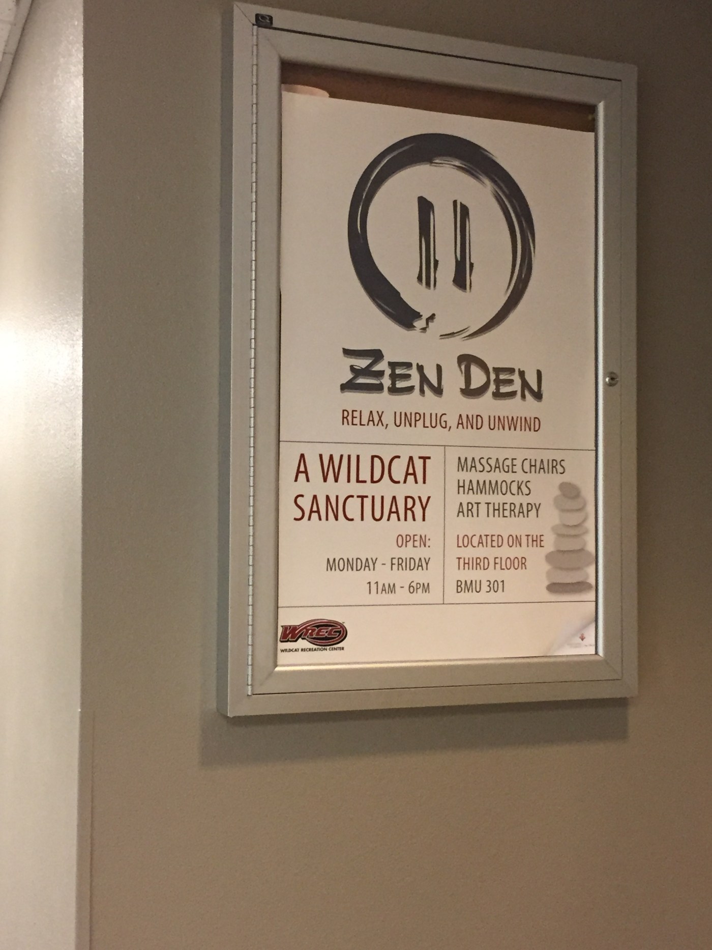 Even though it was just the second week of college, I was already feeling some small amount of fatigue setting in. I just got out of class and I was feeling sleepy, I was heading over to the library when I overheard some students talking about going to the Zen Den. Everything phased out from their conversation for me, and all I heard was “The Zen Den is on the third floor of the BMU.” I immediately headed straight to the Zen Den. I arrived at the Zen Den quite quickly considering I was at Butte Hall. I entered the Zen Den quietly hoping not to disturb the quietness inside. As I opened the door to the Zen Den, I noticed how quiet it was, like scary quiet.