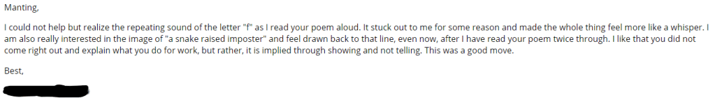 I could not help but realize the repeating sound of the letter “f” as I read your poem aloud. It stuck out to me for some reason and made the whole thing feel more like a whisper. I am also really interested in the image of “a snake-raised imposter” and feel drawn back to that line, even now, after I have read your poem twice through. I like that you did not come right out and explain what you do for work, but rather, it is implied through showing and not telling. This was a good move.